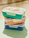 - دارای 3 ظرف مجزا از هم (ظرف پلاستیکی، ظرف استیل 3 خانه، کاسه استیل با درپوش سیلیکونی) و قاشق مخصوص